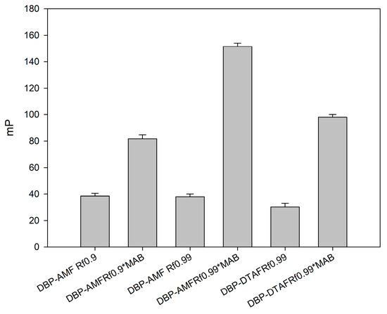 For the development of FPIA, the DBP-AMF and DBP-DTAF tracers were synthesized (the structures are shown in Figure 1). The obtained conjugates were purified by thin-layer chromatography (TLC) and main fractions with a retention factor (Rf 0.9) were studied. To check the resulting conjugates, working solutions of each fraction were prepared, and dilutions of stock tracer solutions were selected so that their fluorescence intensity exceeded the background signal of a pure buffer by a factor of 20. The concentration of tracers working solutions was 5 nM. At a given concentration, the tracers gave the optimal signal/noise ratio and, consequently, a stable value of the fluorescence polarization. The main characteristic of tracers is their binding to specific antibodies. Therefore, we undertook a study of the binding of our tracers to monoclonal antibodies obtained against DBP. The resulting monoclonal antibodies against DBP (MAb-DBP) were added to the working solutions of the tracers DBP-AMF and DBP-DTAF, and the FP signal was measured (Figure 2). Both tracers DBP-AMF and DBP-DTAF were shown to bind to MAb-DBP. It is known that the development of highly sensitive FPIA requires a high quality of immunoreagents [56]. Therefore, we undertook additional purification of tracers by TLC; the obtained conjugates DBP-AMF Rf 0.99 and DBP-DTAF Rf 0.99 were also tested for binding to the monoclonal antibody MAb-DBP. The results are shown in Figure 2. The tracer fluorescence polarization signal after repeated purification increased markedly when bound to antibodies.
