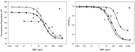 Dependence of the fluorescence polarization signal in the competitive FPIA format at different concentrations of MAb-DBP antibodies (a) and normalized curves (b) in the reaction mixture of 16 (○-curve 1) and 8 nM (●-curve 2) for DBP-AMF 2.5 nM and 16 nM MAb-DBP and (▼-curve 3) DBP-DTAF 2.5 nM (25 °C, pH 8.5).