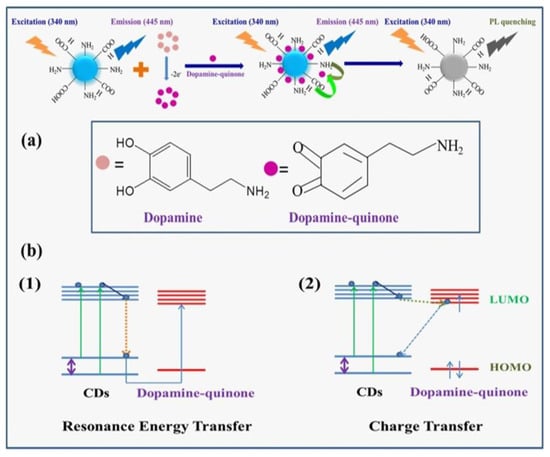 where n is the refractive index of the medium in the spectral overlap, Q is the quantum yield of the donor in the absence of the acceptor, and J(λ) is the spectral overlap. κ2 is the orientation factor of two dipoles. Among the several photophysical phenomena that have been explored for the fluorescence-sensing mechanism, the FRET-based system is very effective and accruable for sensing applications. Amit Kumar et al. fabricated fluorescent carbon dots from porcine pancreatic lipase (PPL) [20]. The emission intensity of carbon dots is effectively quenched by dopamine quinone complex via the fluorescence resonance energy transfer (FRET) process, which is illustrated in Figure 1. This FRET process only occurs when donors and acceptors that have appropriate energy levels from the visible to near-infrared region are within the Förster distance of <50 Å.