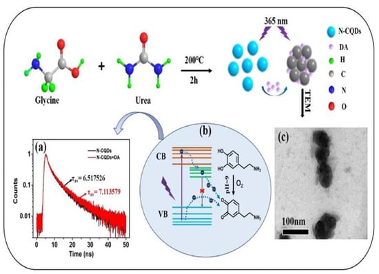 - Ma, Y.; Chen, A.; Xie, X.; Wang, X.; Wang, D.; Wang, P.; Li, H.; Yang, J.; Li, Y. Doping effect and fluorescence quenching mechanism of N-doped graphene quantum dots in the detection of dopamine. Talanta 2019, 196, 563–571. [Google Scholar] [CrossRef] [PubMed]