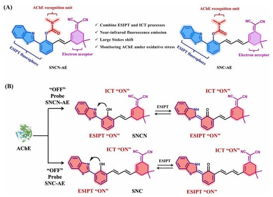 ESIPT is a process in which proton exchange occurs via the intramolecular hydrogen bonding between the proton donor and acceptor groups within a molecule. To improve the detection efficiency, the proton migrate between donor and acceptor atom is accompanied by large Stokes shifts. The first study of ESIPT for salicylic acid was reported by Weller in the 1950s [23]. The most common ESIPT fluorophores include 2-(20-hydroxyphenyl) benzimidazole, 2-(20-hydroxyphenyl) benzoxazole, and 2-(20-hydroxyphenyl) benzothiazole. Most ESIPT fluorophores have dual emission, large Stokes shift and high sensitivity to microenvironment. During photoexcitation, the molecules undergo a redistribution of electronic charge, increasing the acidity of the hydrogen bond donor group and the basicity of the hydrogen bond acceptor group within the E form [24]. Because of this rapid photoexcitation, ESIPT fluorophores are widely used as fluorescent probes, biosensing elements, and imaging agents in bioimaging techniques. Wei et al., designed a probe that combines ESIPT and ICT processes to make specific detection of AChE activity, which is shown in Figure 3 [25]. This enzyme activity interferes with the Ach metabolism and its over expression is related to many neurodegenerative diseases. It is believed that the fluorescent probe utilizing the ESIPT sensing mechanism will provide good photostability and perform with large Stokes shift.