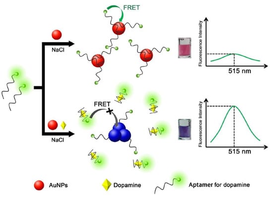Mechanism for dopamine detection using FAM-labeled aptamers and AuNPs. Reprinted from ref. [36] Copyright (2016) with permission from Elsevier.