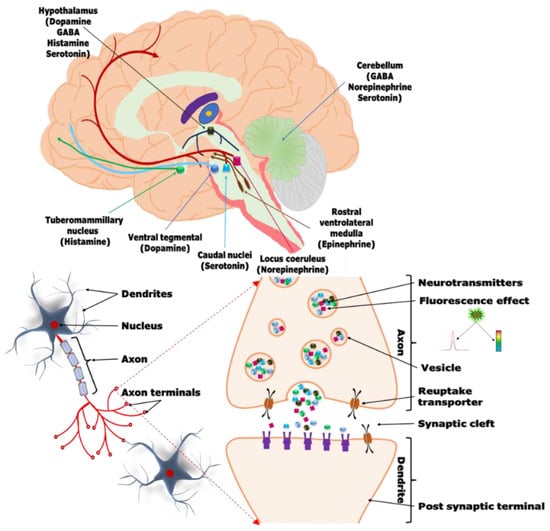 The Schematic diagram shows the basic mechanism of neurotransmission, neurotransmitters, and fluorescence sensing. Release of neurotransmitters from presynaptic neurons and individual biosensors are capable of detecting depending on the concentration and distribution of the probes by fluorescence signal intensity.