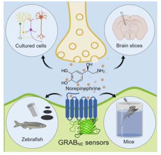 - Feng, J.; Zhang, C.; Lischinsky, J.E.; Jing, M.; Zhou, J.; Wang, H.; Zhang, Y.; Dong, A.; Wu, Z.; Wu, H. A genetically encoded fluorescent sensor for rapid and specific in vivo detection of norepinephrine. Neuron 2019, 102, 745–761.e748. [Google Scholar] [CrossRef] [PubMed]