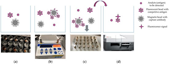 Schematic workflow of BFPD-IA: (a) mixing of all reagents, namely the serum sample, the assay buffer, the antibody-coated magnetic beads, and the competitive-antigen-coated fluorescent beads in a reaction well of a microtiter plate (MTP); (b) incubation of the reagents in a single step, on a BioShake iQ device (QInstruments, Jena, Germany) (37 °C, 650 rpm), which leads to the capturing of the sample antigens and the fluorescent-bead-coupled antigens on the antibody-coated magnetic beads; (c) use of a custom-made magnet rack, positioned under the MTP for magnet-induced separation and collection of the magnetic beads at the bottom of each MTP well (the gray arrow indicates the collection of magnetic beads); (d) transfer of 50 µL of supernatant (bound-free phase) to another well for fluorescence detection on Tecan Spark M10 Tecan (Männedorf, Switzerland)—the transfer is indicated with the magenta-colored arrow.