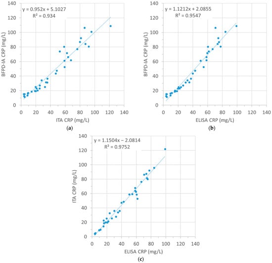 For the BFPD-IA calculation of the CRP concentration, we used the average standard curve (Supplementary File S1), which we acquired as described in Section 2.4. As it was the average of six individual curves over four measurement days, it is representative of the inter-day and inter-plate variability. The average signal CV over all the standards was 6.6% (7.3% when including the negative control). Furthermore, our quantification range (11–115 mg/L) is comparable with those used by some commercial systems [29,30]. The CRP concentrations of the clinical samples are given in Supplementary File S4. We correlated the absolute values acquired using the three measurement methods by means of scatter plots (Figure 2).