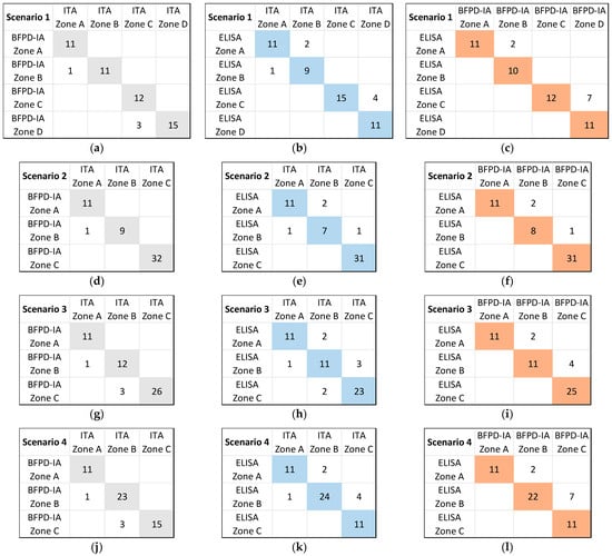 Number of samples classified using ITA, ELISA, and BFPD-IA in defined concentration zones per scenario: (a) scenario 1, comparison of ITA vs. BFPD-IA; (b) scenario 1, comparison of ITA vs. ELISA; (c) scenario 1, comparison of BFPD-IA vs. ELISA; (d) scenario 2, comparison of ITA vs. BFPD-IA; (e) scenario 2, comparison of ITA vs. ELISA; (f) scenario 2, comparison of BFPD-IA vs. ELISA; (g) scenario 3, comparison of ITA vs. BFPD-IA; (h) scenario 3, comparison of ITA vs. ELISA; (i) scenario 3, comparison of BFPD-IA vs. ELISA; (j) scenario 4, comparison of ITA vs. BFPD-IA; (k) scenario 4, comparison of ITA vs. ELISA; (l) scenario 4, comparison of BFPD-IA vs. ELISA. Such representation allows us to note the relative discrepancy between two methods and towards which zone.