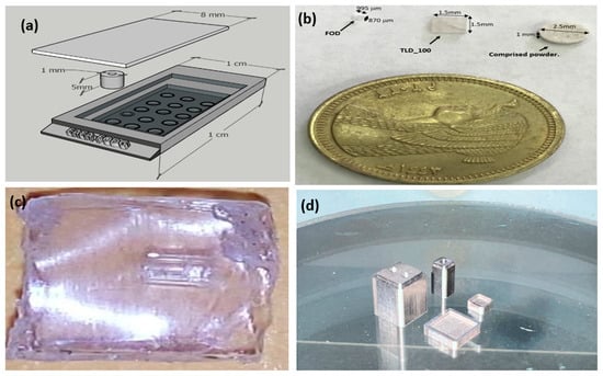 Furthermore, Teflon is a good candidate as it was used before as a holder for TLD-100 [], as shown in Figure 1c. Concerning the prototype, a 3D-printed metal holder is fabricated using titanium (Ti-6A1-4V), which is an excellent material for high temperatures. Unfortunately, its transparency to gamma-ray is very poor. The used printed holder is fabricated by al-charm™, Taiwan [].