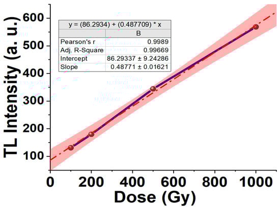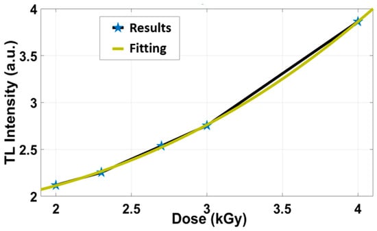 In Figure 2, f(D) < 1 corresponds to values below the extrapolated linear region, i.e., sublinearity, f(D) = 1 corresponds to the linear region, and if f(D) > 1 indicates values above the extrapolated linear region, i.e., supralinearity. The dosimeter under study showed a linear–supralinear condition for a dose ranging from 0.1 to 1 kGy, as the values obtained were higher than unity.