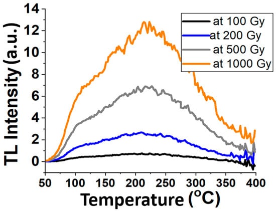 Radiation monitoring can be accomplished using thermoluminescence (TL). The luminescence is proportional to the intensity of the ionizing radiation incident on the fiber, whereas the luminescence intensity is proportional to both the intensity of ionizing radiation and the accumulated ionizing radiation history. It is worth noting that the measured TL intensity represents all the intensity within the sample collectively, including the residual energy which was not drawn out during the measurements. Figure 2 depicts the variation in the TL intensity as a function of the radiation dose. The results are for FOD subjected to gamma-ray emanated from a Cobalt 60 industrial irradiator, (60Co cell-220 (GC220)), available at EAEA. Evidently, the response is linear in the range of dose from 100 Gy to 1000 Gy. However, in this study, we focused on a radiation dose in the range of 1~100 Gy. Figure 3 shows the glow curves for different doses from 100 to 1000 Gy. It is noticeable that as the temperature increases, the TL intensity also increases until a peak value around 220 °C is reached, after which it decreases towards zero as the temperature continues to increase.