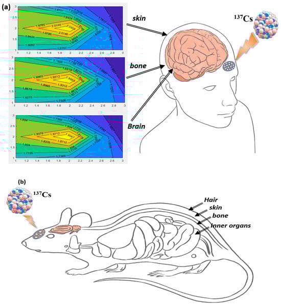 (a) The main parts of the human through radiotherapy are skin, bone, and brain. (b) The main parts of rat hair are skin, bone, and inner organs.