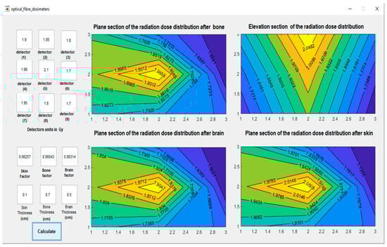 The graphical user interface (GUI) of the program is divided into two sections: on the left are nine detectors showing the dose readings, and below them are the attenuation factors and thickness of each organ. On the right is a four-contour map of the absorbed doses in the plan and elevation sections.