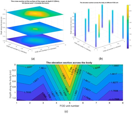 For more demonstration, Figure 7 shows the 3D dose distribution along the organs: skin, bone, and brain. Figure 7a shows the cross-sections at the surface of the organs at depths: 0.1 cm in the case of the skin, 0.8 cm in the case of the bone, and 1.3 cm in the case of the brain. Evidently, the intensity distribution of the doses decreases. Moreover, Figure 7b shows the elevation section for the nine FOD detectors across the organs along the depth of the body. Furthermore, Figure 7c shows how the elevation section is used to measure the dose of radiation at different depths inside the three organs. The x-axis represents the FOD number, which starts at 1 for the uppermost left unit and ends at 9 for the lower right unit. The y-axis represents the distance inside the body in centimeters, with 0 being the surface. Indeed, due to the FOD’s small size, it allows for more investigation along small irradiated areas.