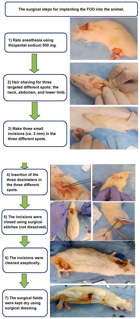 Illustrates the process of inserting and extracting the fiber optical dosimeter, consisting of seven steps. The images on the right side depict the steps of the process. In the study, animals were exposed to γ-rays in a single shot, receiving a dosage of 2 Gy at a rate of 5.8 Gy/s. The irradiation was performed using a 137Cs source (Gamma-cell-40 Exactor; NCRRT, Cairo, Egypt). To ensure dose uniformity and accuracy, dosimetry was applied in all experiments, utilizing a Fricke reference standard dosimeter [].