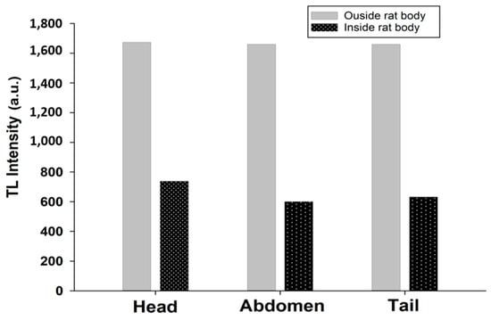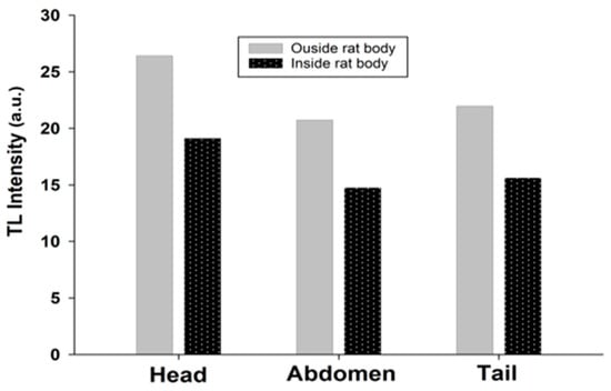 For FOD samples transplanted inside the body of a rat, the measured value is attenuated to 44%, 36%, and 38% at the head, the abdomen, and the tail, with respect to the value measured outside the rat’s body at the same dose, as shown in Figure 9. For standard materials (TLD-100) transplanted inside the body of the rat, the measured value attenuated to 73%, 71%, and 72% at the head, the abdomen, and the tail, respectively, of the value measured outside the rat’s body at the same dose, as shown in Figure 10.