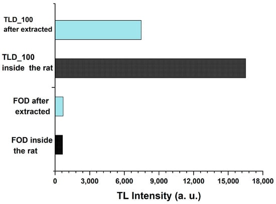 All samples (FOD and TLD-100) were transplanted inside the rat’s body after extraction, and measurements were annealed at 400 °C for 1 h and irradiated to 2 Gy (the same dose that irradiated the rat previously). The results of the measurements showed that TLD-100 decreased by 45% from the original one and was detected inside the body of the rat, whereas the intensity of FOD does not change and remained intact, as shown in Figure 11. These results prove FOD’s accuracy compared to TLD-100.