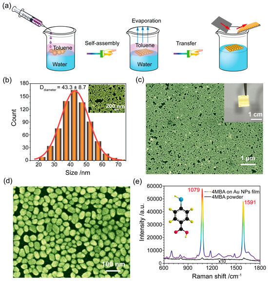 Monodisperse Au NPs were synthesized via the sodium citrate reduction method, and, subsequently, a large area of the Au NPs monolayer film was obtained via a liquid/liquid interfacial self-assembly strategy, which is based on the Marangoni effect [29] (see Figure 1a). Figure 1b provides the size distribution of monodisperse Au NPs by using Nano Measurer 1.2.5, according to the SEM images (Figure 1b). The mean size of the prepared Au NPs was 43.3 ± 8.7 nm. A large-area assembly of Au NPs film transferred onto Si wafer could be achieved with an area of 1 × 1 cm2, as shown in Figure 1c. Moreover, the Au NPs monolayer films were characterized by SEM images, as shown in Figure 1c,d. It can be easily found that the Au NPs films were well self-assembled, without obvious aggregates and large voids. As a result, these were prerequisites for good uniformity and reproducibility as SERS substrates in this study.