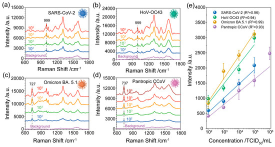 SERS spectra of (a) SARS-CoV-2, (b) HoV-OC43, (c) SARS-CoV-2 variant Omicron BA. 5.1 and (d) pantropic CCoV at different concentrations (102–106 TCID50/mL). (e) The corresponding standard dose–response curve of SARS-CoV-2, HoV-OC43, SARS-CoV-2 variant Omicron BA. 5.1 and pantropic CCoV is obtained by using the peak intensity at 999 cm−1, 999 cm−1, 727 cm−1 and 737 cm−1, respectively. The background is related to the blank samples without a virus.