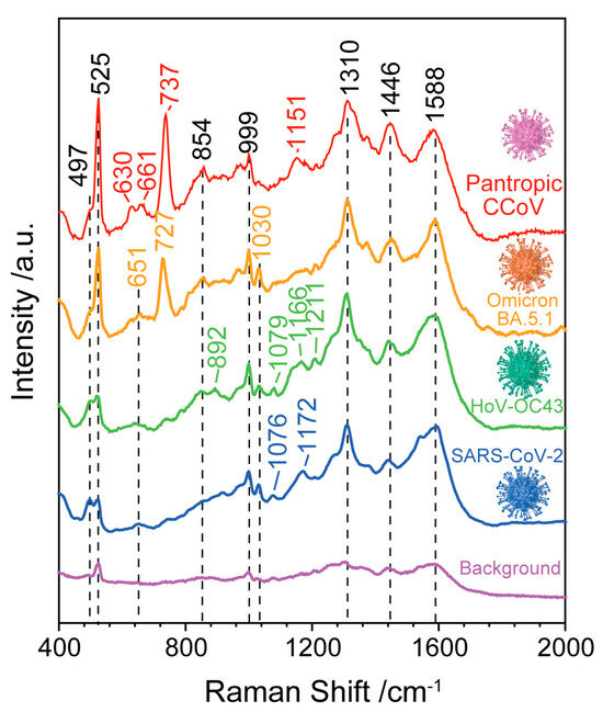 SERS spectra of SARS-CoV-2, HoV-OC43, SARS-CoV-2 variant Omicron BA. 5.1 and pantropic CCoV. The background is related to the blank samples without a virus.