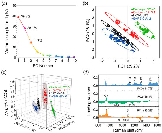 To conduct a more systematic analysis of the entire SERS spectral data set obtained from these four types of viruses, we used the PCA method for each data set. The PCA method can not only extract the key spectroscopic information but also capture the differences in the SERS spectra between viral particles. First, we needed to compute the eigenvalues from a covariance matrix to determine the principal components (PCs) of the data. The principal components are given according to the linear combination of variables [54],