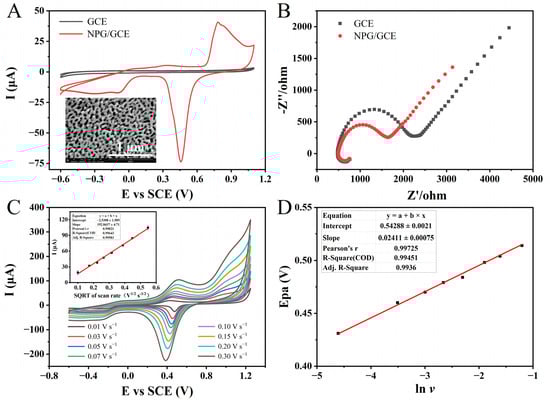 First, the GCE was sequentially polished with α-Al2O3 slurry of different particle sizes (1.0 µm, 0.3 µm, and 0.05 µm), followed by immersion in ultrapure water and anhydrous ethanol for ultrasonic cleaning. NPG films were prepared by dealloying Au/Ag sheet (Au50Ag50, wt%) in concentrated nitric acid at 40 °C for 1 h [35]. After covering the acid-etched NPG film onto the surface of the GCE (Figure 1A), an appropriate amount (3 μL) of Nafion solution (0.5 wt%) was introduced to enhance the stability of the NPG/GCE electrode assembly. Then, the NPG/GCE electrode was activated in H2SO4 (0.5 mol L−1) solution by cyclic voltammetry (CV). CV was repeatedly performed with a scanning rate of 50 mV s−1 within the voltage range of 0.35–1.55 V until a stable curve was obtained. All tests were conducted in a three-electrode system, utilizing the NPG/GCE electrode as the working electrode, the platinum as the counter electrode, and the SCE electrode as the reference electrode.