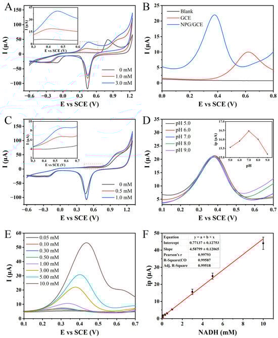 In the presence of 3.0 mM of NADH in the PBS (pH 7.0, 100 mM), CV techniques were conducted using the NPG/GCE electrode at different scan rates (Figure 2C). Within the scanning potential range from −0.7 V to +1.2 V, a couple of asymmetrical redox peaks were obtained from the cyclic voltammetry. Moreover, with the escalation in the scanning rate, both the redox peak currents and redox potentials manifested noticeable alterations. The Epa exhibited a positive shift from +0.43 V at +0.01 V s−1 to +0.52 V at 0.3V s−1, indicating an increasing irreversibility of the electrode reaction. Simultaneously, the oxidation peak current increased from 19.00 μA to 104.50 μA. A fitting analysis revealed a positive correlation between the oxidation peak current and the square root of the scanning rate, described by the following linear regression equation: I (μA) = 192.8437 × v (V1/2 s−1/2) − 2.5308, (R2 = 0.9958). Consistent with previous research [41], the electrocatalytic oxidation of NADH on the surface of the NPG/GCE electrode exhibited a diffusion-controlled behavior. The fitting curve can prove that there is a linear relationship between the Epa(NADH) and the natural logarithm of the sweep rate, whose linear equation is Epa(NADH) = 0.02411 × lnv + 0.54288 (R2 = 0.9936) (Figure 2D). Based on the Laviron equation, the electron transfer number (n) during the process of NADH oxidation can be determined as 2 [42]. This result is consistent with the electron transfer stoichiometry observed in previous investigations of NADH oxidation [43].