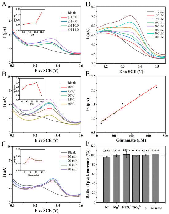 (A) The DPVs of the NPG/GCE for the reaction of 1.0 mM glutamate in PBS (100 mM) with different pH values (8.0–11.0) for 20 min. Inset: the relationship between the oxidation peak current and the pH value of the enzyme reaction. (B) The DPVs of the NPG/GCE electrode reacted with 1.0 mM glutamate in PBS (pH11.0, 100 mM) at different temperatures (40–60 °C) for 20 min. Inset: the relationship between the measured oxidation peak current and the enzyme reaction temperature. (C) The DPVs of 2.0 mM glutamate with NPG/GCE electrode after reaction in PBS (pH 11.0, 100 mM) and 55 °C for 10–40 min. Inset: the relationship between the measured oxidation peak current and the enzyme reaction temperature. (D) The DPVs of 0–700 μM glutamate by NPG/GCE electrode after reaction in PBS (pH 11.0, 100 mM) and 55 °C for 20 min. (E) The fitting relationship between the measured oxidation peak current value (ip) and glutamate concentration. (F) The effect of common substances (5.0 mM) in clinical samples and fermentation broth samples on glutamate (500 μM) detection.