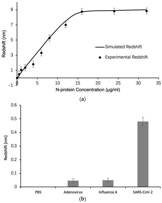 The working mechanism of the TPP biosensor is based on perturbation theory [48], wherein biomolecules interact with confined electrical field of electromagnetic resonant mode of photonic spectrum. TPP is a resonant surface electromagnetic state with strong field confinement near the interface between metal and dielectric DBR. Any biomolecular binding will interact with the electrical field of the resonant mode and disturb its electrical field distribution profile. This perturbation results in a shift of the TPP resonant wavelength and reflection intensity in TPP reflection spectrum. The shift in wavelength is towards longer wavelength which is also called “redshift”. In this work, biomolecules are detected by detecting the redshift which is based on capturing the TPP resonant wavelength of both before and after biomolecular binding and calculating their difference. This has the advantage that any fluctuation of light intensity due to light source instability or ambient lighting change does not affect the detection of resonant wavelength, and thereafter the detection results. The operational procedure of biosensing is as follows. First, clinical specimens need to be taken from patients, such as saliva or swab specimen. Then the specimen is immediately placed in lysis buffer (viral transport medium (VTM) supplied by YOCON Biology Technology Company (Beijing, China)) to break down the virus and release its N-protein. This lysis sample containing N-protein can be used for biosensing directly since lysis solutions have been reported to keep the protein antigens bioactive for antibody recognition [49]. Alternatively, for biosensor characterization purposes, we can use commercially available N-proteins (Xlement Cat. No. C10002) as a target of detection and use different titration in PBS buffer to detect with the TPP biosensor. In this work, we use the latter approach for sensitivity, and limit the detection characterization and the former approach for specificity characterization. A volume of around 20 µL of the specimen is taken from the sampling tube and dropped onto the biosensor surface, then a cover glass is placed on top of the specimen to flatten the liquid surface and facilitate spectral measurement. After the cover glass is placed, the first reflection spectrum is collected as the spectrum before biomolecular binding. After binding reaction between N-proteins and antibodies completes which is about 10 min, the second reflection spectrum is collected as the spectrum after biomolecular binding. The two spectra of before and after reactions are compared and analyzed to determine the detection result. Note that rinsing the biosensor surface after binding reaction completes is not necessary, since any non-specific adsorption of bio species on thin metal film or even inside nanopores of thin metal film has little effect on the TPP resonance. This is because the electrical field in the thin metal film and beyond the thin metal film in the specimen reaction region is negligible. For a real time detection of N-protein binding with antibodies, the reflection spectrum of the TPP biosensor is automatically collected every 10 s in a ten-minute reaction process, without any disturbance of the biosensor or the cover glass.