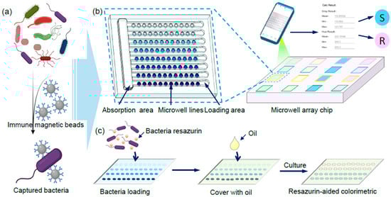 Microfluidic chips are increasingly popular AST tools that not only greatly improve the detection throughput but also sharply reduce the reagent cost of conventional AST with an adjustable volume from microliter to femtoliter [24,25,26,27]. In particular, droplet-based microfluidic AST methods can be operated with high throughput on the single-cell level [10,28,29]. Among them, a micro-well array is an excellent research tool for generating hundreds of independent wells without a precise process [30,31], allowing the tracking of bacterial growth in droplets over time in an antibiotic-amended medium [32]. However, in the application of AST, micro-well arrays are usually fabricated based on photolithography technology and accompanied by delicate instrumentation, such as a fluorescence microscope [30,33], resulting in difficulty in achieving the point-of-care in resource-limit conditions. It is ecologically attractive to develop a microarray chip using low-cost manufacturing technologies (e.g., 3D printing) compared with the photolithography technology and to integrate it with portable equipment, such as smartphone applications [34], for high-throughput testing to both meet convenience requirements and maximize its cost efficiency.