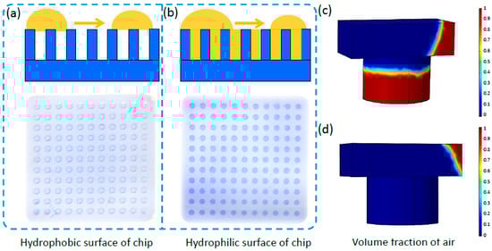 The simulation and analysis of the process of the water flow through the micro-well on a hydrophobic and hydrophilic surface in the micro-well array chip. (a,b) The state of water on the micro-array chip with a hydrophobic surface (a) and hydrophilic surface (b). (c,d) Simulation of the volume fraction of air during the process of water flow through the micro-well in the hydrophobic surface (c) and hydrophilic surface (d).