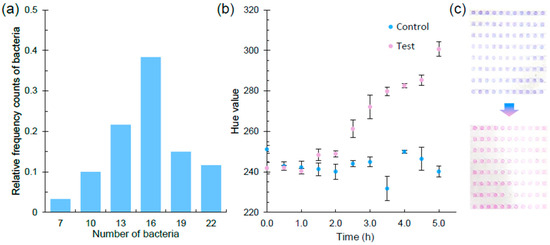 The AST results report for our proposed rapid AST system was based on the monitoring of the hue value in the micro-wells using Bioimage (v3.1), a smartphone APP that was developed in-house to automatically analyze the image data (https://github.com/emblab-westlake/Bioimage (accessed on 11 August 2022)). The cell number in the micro-wells (n = 60 wells) ranged from 7 to 22 (Average = 14.5 ± 3.7) in the micro-well array chip (Figure 3a). The change in color could be recorded by calculating the hue value based on Hue–Saturation–Lightness color space converted from the Red–Green–Blue model using the smartphone APP [47] (Figure 3b). Hue value classified colors within a wide range of [0, 2π], where 4/3π represents the pure blue and 2π represents the pure red, which will not be affected by different brands/models of mobile phones (Table S1). The color of a bacterial solution with resazurin would change from blue to pink with the normal growth of cells as the resazurin could be converted to resorufin (Figure 3c). During this process, the hue value would increase continuously with a large range (4/3π–2π) and is suitable to demonstrate the on-chip metabolic activity of examined bacterial cells. After culturing for 5 h, the hue value of the control group was around 240, while the positive group was up to ~300 and remained stable. Therefore, the threshold hue value was determined as 260 for further determination of the growth or inhibition for E. coli MG1655. We found that this time point and threshold hue value was also suitable for testing the other three bacteria, i.e., E. coli EFE10, E. asburiae CSS13, and S. typhimurium. In addition, a high-throughput phenotype-based AST method is usually performed optically in the micro-array wells [30,48,49]. The high-throughput micro-well arrays associated with colorimetric readout in AST also provided an appropriate point to combine with a smartphone, which has been developed as a simple-to-operate mobile health device [18], to achieve high-throughput phenotypic-based AST with cost-effective and portable detection apparatuses. Furthermore, the number of bacteria in the wells followed a Poisson distribution with λ = 15. In order to achieve an even hue value, ten micro-wells were selected for recording. Therefore, the number of wells in each line was set as 12 in the micro-well array chip to ensure that there were at least 10 micro-wells available for recording in case a few of the wells accidentally dried out.