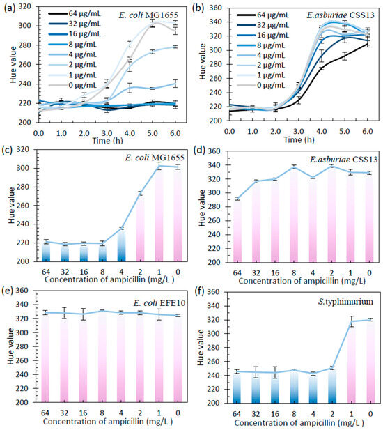 Micro-well array-based colorimetric antibiotic susceptibility testing (macAST) results of four bacteria in different concentrations of ampicillin. (a,b) Hue value records using Bioimage APP for E. coli MG1655 and E. asburiae CSS13 with the treatment of ampicillin (data are represented as mean ± s.d., n = 10). (c–f) AST result of E. coli MG1655, E. asburiae CSS13, E. coli EFE10 and S. typhimurium against ampicillin in 5 h; blue and pink bar represent the inhibited and normal growth of the bacteria, respectively (data are represented as mean ± s.d., n = 10).