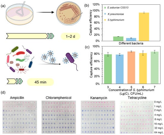 Although AST for pathogenic isolates or pure cultures is significant, it is imperative to acknowledge that, in practical, clinical, or environmental contexts, bacterial strains do not exist in isolation but instead in closely interconnected communities [35]. In addition, human pathogens require special isolation by laborious culturing, which is another key limiting factor for shortening the total turnaround time and cost-efficiency of AST [36]. In particular, clinically important and environmentally occurring pathogenic bacterial strains, such as Salmonella Typhimurium [37], need a special selective medium and complex process for isolation to gain the pure culture eventually. Immunomagnetic separation selectively enriches the target bacteria by directly separating them from the complex community, bypassing the requirement for isolation and facilitating further target cultivation [38,39,40]. The captured bacteria can also be more easily and more likely to be cultured from a community sample, as intense on-plate competition may weed out the less competitive but directly capturable species. The immunomagnetic separation with captured cells or their cultures provides a potentially efficient method to integrate into the AST process for routine screening of antibiotic resistant bacteria in different situations, such as environmental monitoring and healthcare facilities.