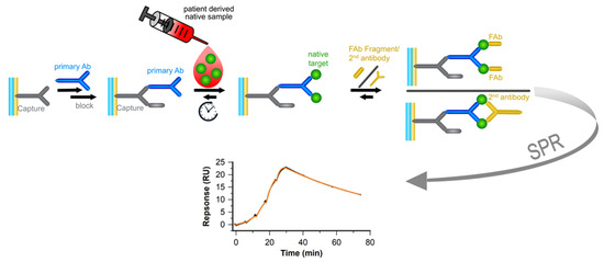 We envisioned investigating the functionality of binders and their potential as reagents in diagnostics’ immuno-based assays or as pharmaceutical drugs using native targets from patient samples early on in the SPR-based development process. Furthermore, we seek to overcome the challenges of measuring kinetic properties in the presence of complex matrices by using the native target as ligand—surface-displayed and enriched via a primary antibody.