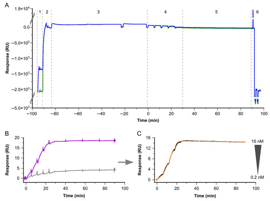Exemplary sensorgrams for the determination of kinetic binding constants for low-abundant native targets and antibodies. The sensorgrams show the response signal in resonance units (RU) plotted against the time in minutes (min). (A) Sensorgrams for complete cycles of non-referenced data on Fc1 (reference, green) and Fc2 (active, blue). The different steps are depicted by the dotted lines. (1) The first antibody is bound on Fc2 by a covalently attached capture antibody. (2) Subsequently, a non-target-related antibody of the same species as the primary antibody is injected on Fc1 and 2. This antibody serves for referencing on Fc1, and additionally blocks free binding sites of the capture antibody on Fc1 and 2. (3) In the next step, the target is injected for t = 80 min. (4) Next, five consecutive injections with increasing concentrations of the second sandwich-pair antibody are applied, followed by (5) the dissociation phase. (6) Finally, the regeneration is applied. Here, the second binder represents an antibody Fab fragment, to ensure monovalent binding and to determine the interaction’s affinity. (B) Zoomed-in view of the second binder binding to the target as shown in (A); now, Fc2 is referenced versus Fc1, resulting in Fc2-1. The antibody concentration series (magenta) is overlaid with a blank, using a buffer instead of a second antibody (light gray). (C) Identical interaction to that shown in (B); here, double-referenced vs. blank (black) overlaid by the Langmuir 1:1 fitting (orange).