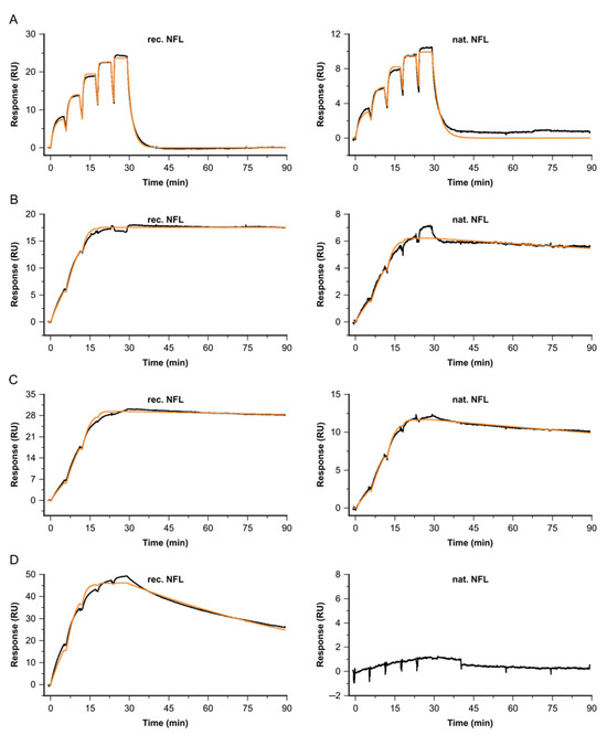 Kinetic profiles for a selection of Fabs binding to recombinant NFL (left) vs. native NFL from cerebrospinal fluid (right), at 37 °C. Sensorgrams (black) are overlaid with a Langmuir 1:1 fitting model, Rmax global, RI = 0 (orange). Concentrations for (A) Fab A, (B) Fab B, (C) Fab C and (D) Fab I were varied, depending on their kinetic properties: c(A) = 3.7, 11.1, 33.3, 100, 300 nM, c(B) = 0.4, 1.1, 3.3, 10, 30 nM, c(C) = 0.2, 0.6, 1.7, 5, 15 nM and c(I) = 1.5, 4.4, 13.3, 40, 120 nM.