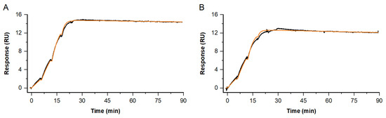 Standard sensor CM5-chips Series S and amine coupling kits from Cytiva were used. As system buffers, HBS-N pH 7.4, containing 10 mM HEPES, pH 7.4, and 150 mM NaCl, and HBS-EP+, pH 7.4, containing 10 mM HEPES, pH 7.4, 150 mM NaCl, 3 mM EDTA and 0.05% (w/v) Tween20 were used, all from Cytiva. PBS-Buffer 10× (0.2 M phosphate buffer with 27 mM KCl, 1.37 M NaCl) from Roche was used, diluted 1: 10 with 0.5% Surfactant Tween 20 (Sigma-Aldrich, St. Louis, MO, USA), as additive.