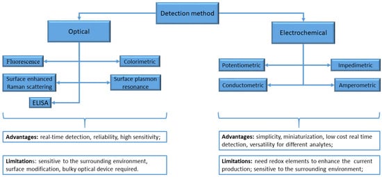A biosensor typically consists of two connected components: a chemical recognition system (the receptor) and a physicochemical transducer. The receptor system detects and interprets the interaction between the analyte and receptor, and then transfers this information to the transducer, which produces a measurable signal. This signal can then be read and recorded by a measuring device [22]. Biosensors can be divided into two categories based on the detection method used: optical and electrochemical sensors. Optical biosensors are highly effective in providing valuable information about a sample, such as kinetic behavior, concentration, and molecular interaction. One of the key advantages of optical biosensors is that they avoid electrical or magnetic interference, making them highly accurate. Additionally, they are highly sensitive and can detect analytes even at very low concentrations such as attomolar and femtomolar levels. However, despite these advantages, electrochemical biosensors are still the most commonly used type of portable biosensor, mostly because they are easier to miniaturize [23].
