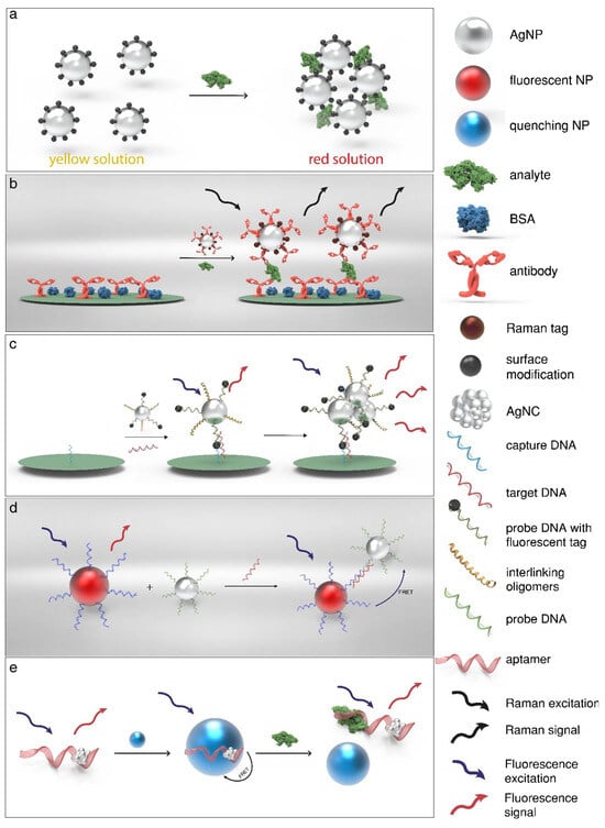 Schematic representation of the working principle of various optical biosensors using AgNPs based on (a) SPR, (b) SERS, (c) MEF, (d) FRET, or (e) the inherent fluorescent properties of AgNCs. Reprint from [57].