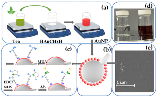 Schematic overview of the full functionalization of ball resonator optical fibers using green-synthesized AuNPs decorated with biological recognition elements to detect an analyte: (a) the synthesis of AuNPs from green tea extract; (b) the immobilization of AuNPs onto the surface of the ball resonator optical fiber after the APTMS treatment; (c) the functionalization of the gold-coated sensor with antibody after pre-treatment with MUA and EDC/NHS; (d) the visual change in color from colorless to wine-red during synthesis; (e) the SEM image showing the surface of ball resonator optical fibers attached to AuNPs. Reprint from [92].