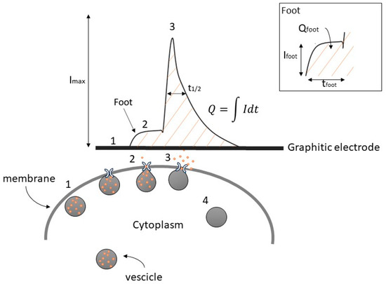 In some instances, a distinctive characteristic that has been observed is a small shoulder before the amperometric spike, commonly referred to as the “pre-spike foot” (PSF) or, more simply, foot. The exact nature of this phenomenon during the exocytotic process remains a subject of ongoing debate and study [16,17,18]. Historically, the onset of exocytotic events is described as a gradual release of a small number of catecholamine molecules from a narrow “fusion pore” having a nanometric dimension before the pore itself undergoes dilation for complete exocytosis [19,20]. The conditions of foot formation are associated with the instability of fusion of the granules with the cell membrane, which in the specific condition is not permanent and therefore the fusion pore opens and closes reversibly, so-called flickering fusion [21].