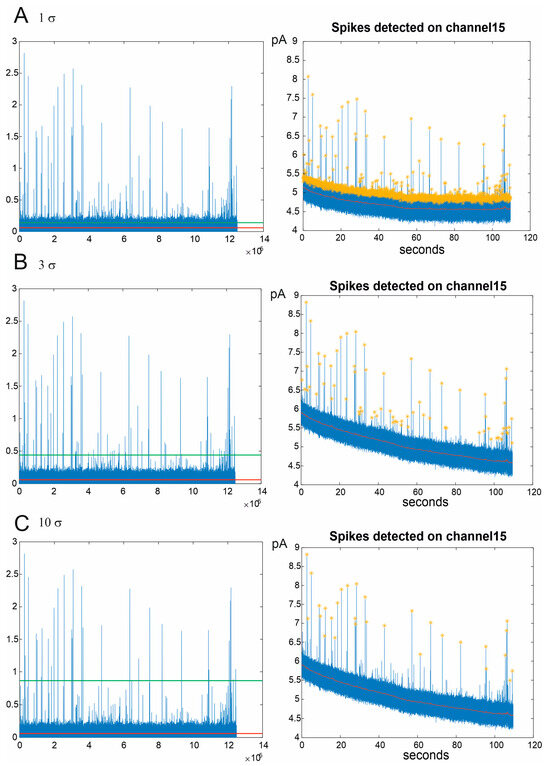 Assuming the background noise follows a white noise pattern with a Gaussian distribution, the threshold is established as a multiple of the standard deviation (σ). While users have the flexibility to adjust the multiplication factor applied to the standard deviation, optimal spike sorting typically employs a setting of 3 σ, encompassing 99% of the noise. In Figure 3, three scenarios are depicted where the multiplication factor is set to low (1 σ), optimal (3 σ), and high values (10 σ), representing, respectively, the misidentification of noise as a signal, the identification of all amperometric peaks, and the loss of numerous spikes.