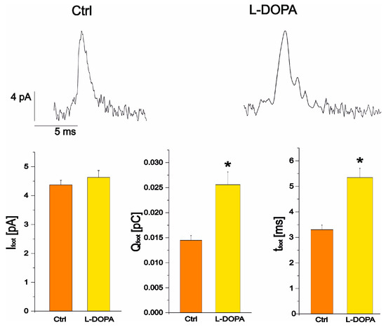 Focusing on foot parameter analysis (Ifoot, Qfoot and tfoot), after L-DOPA incubation, a significant increase in foot-charge and foot-time was revealed, respectively from 0.014 ± 0.001 pC (ctrl n = 76) to 0.026 ± 0.003 pC (L-DOPA n = 100, p < 0.05) and from 3.3 ± 0.2 ms (ctrl, n = 76) to 5.3 ± 0.4 ms (L-DOPA n = 100, p < 0.05). Instead, Ifoot was not significantly altered, being 4.37 ± 0.16 pA in the control condition (n = 76) and 4.48 ± 0.23 pA after L-DOPA incubation (n = 100) (p > 0.05) (Figure 7). These results are in good agreement with those observed by Amatore et al. [20].