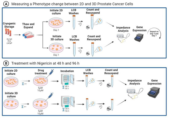 EIS experimental workflow for characterizing phenotype changes in prostate cancer cells. (A) DU145, PC3 and LNCaP cells were obtained from cryogenic storage, thawed, and expanded in proliferation media. About 300 K cells of 2D monolayer and 3D suspension growth were prepared in LCB solution for impedance analysis, while the remaining cells were used for gene expression. (B) Nigericin was added to PC3 cells cultured as 2D monolayer and 3D suspension for 24 h after seeding. The cells were measured for gene expression and impedance 48 h and 96 h after treatment. Figure created with BioRender.com.