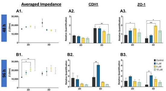 EIS and gene expression of PC3 cells treated with nigericin at 48 h (top) and 96 h (bottom) for the 2D monolayer and 3D suspension culture conditions. (A1,B1) Averaged impedance values with drug treatment, (A2,B2) CDH1, (A3,B3) ZO-1. Drug treatment concentrations reported for control: 0 µM, 5 µM, 10 µM. The 48 h control was measured on D3. The 96 h control was measured on D7. The 0 µM concentration included only DMSO. Statistical analysis completed on pooled data sets. n = 3; * < 0.05, ** p < 0.01, *** p < 0.001.