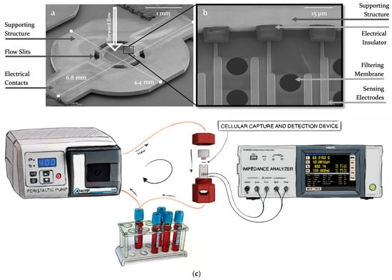 (a,b) Scanning Electron Micrographs of the Cellular Capture and Detection Device. The whole sensing device is shown in (a); (b) is a close-up on the filtering membrane in the central part of the device; (c) is the experimental setup using a peristaltic pump to flow samples through the Cellular Capture and Detection Device. The microfabricated device is encapsulated in the fluidic system using a 3D-printed holder and connected through spring loaded pins tothe impedance analyzer.