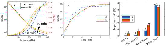 Figure 2a exhibits the typical impedance spectrum profile and gives the magnitude and phase of the device impedance as a function of the frequency from 1 kHz to 5 MHz. Plotted data were obtained at 0 min, 2 min, and 10 min under whole blood circulation through the device. Between 1 kHz and 100 kHz, the device impedance does not change significantly when the blood flows, while in the 100 kHz to 5 MHz range, the impedance magnitude increases gradually over time. Measured impedance spectra can be fitted using a very simple electrical circuit, as discussed in the upcoming sections. In order to better visualize the time variation of the impedance, the magnitude at 1 MHz is displayed in Figure 2b as a function of time for two identical experiments and nominally identical devices. We can notice an increase in the magnitude during the first 4 min and a plateau, indicating a saturation-like behavior before the end of the experiment.