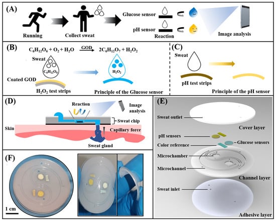 Schematic and optical images of the microfluidic sweat chip. (A) Conceptual diagram of the microfluidic sweat chip. (B,C) Principle of the glucose sensor and pH sensor. (D) Schematic of the sweat collection using the microfluidic sweat chip. (E) Schematic diagram of the microfluidic sweat chip structure. (F) Image of the microfluidic sweat chip.