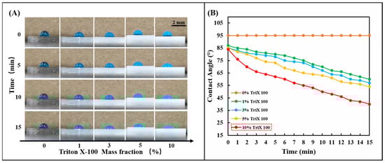 Hydrophilic treatment of PDMS with TritonX-100. (A) Change the mass percentage of Triton X-100 in PDMS (0, 1, 3, 5, 10%) and observe the change of the hydrophilic angle on the PDMS surface within 15 min. (B) The linear change rule of the hydrophilic angle on the surface of PDMS containing different concentrations of Triton X-100 (0, 1, 3, 5, 10%) within 15 min.