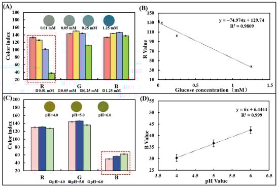 A series of pure samples containing known glucose concentrations (0–1.25 mM) were dropped onto the glucose colorimetric sensor to trigger an enzyme-catalyzed color change. The optical image gradually appears from light blue to dark blue with the glucose concentration increasing (Figure 3A). To select a suitable optical color model, we designed and developed a smartphone-based image detection software through which optical images were collected, and the R, G, and B values in the image color were quantified. After measuring samples containing 0.01 mM, 0.05 mM, 0.25 mM, and 1.25 mM glucose, the differences in R, G, and B values were analyzed comparatively. It was found that there was a linear relationship between the R-value (y) and the glucose concentration (x) from 0.01 mM to 1.25 mM (Figure 3A,B), which can be expressed as y = −74.974x + 129.74 (R2 = 0.9809). Thus, the R-value of the image was chosen as the signal for the detection of glucose in the chip.